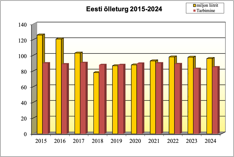 Alloleva graafiku esimene tulp näitab õlle müüki Eestis (sh turistide poolt ostetud kogused) ning teine tulp Eestis tarbitud õlle koguseid (miljonit liitrit).